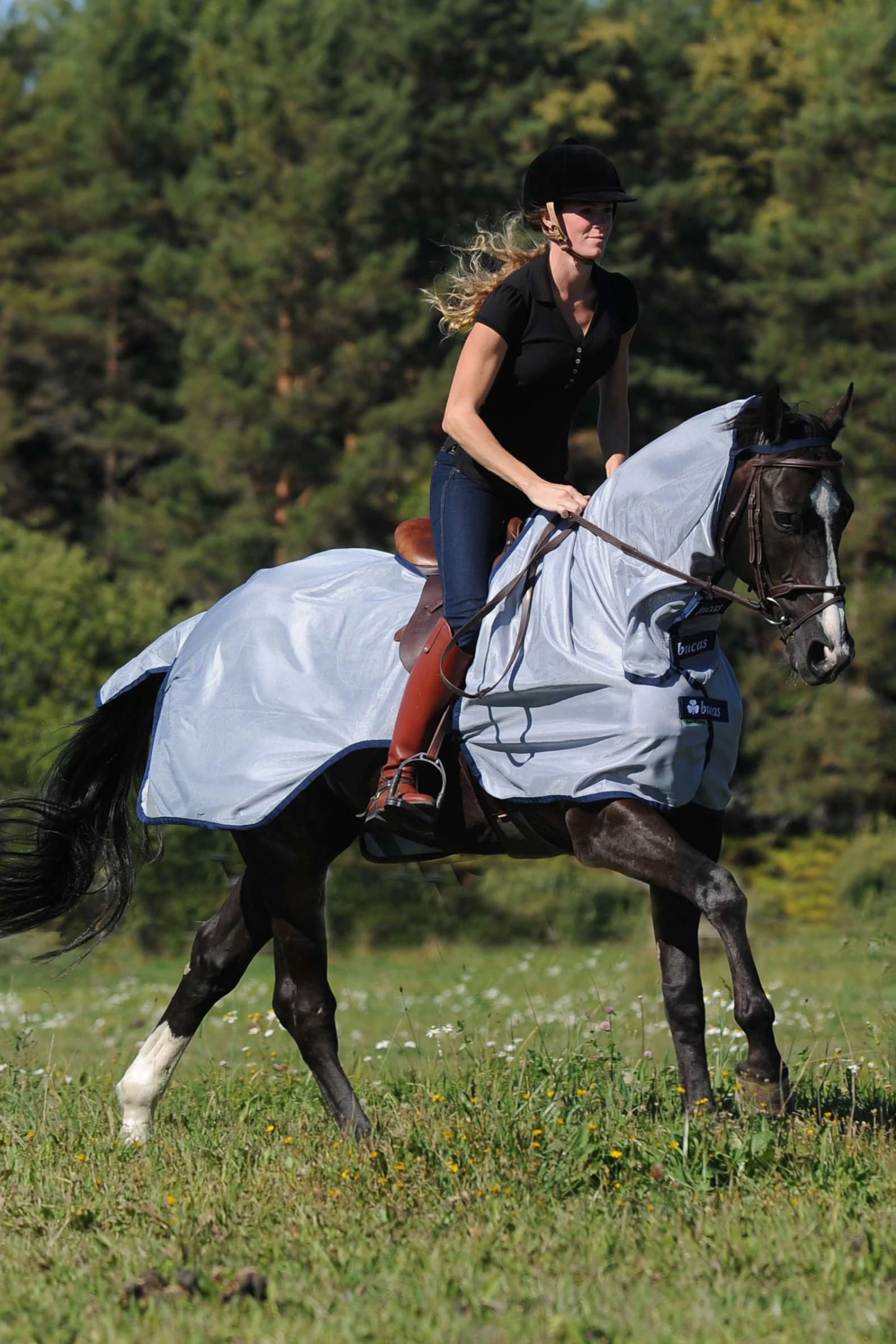 Die Bucas Buzz-off Linie besteht aus einem sehr feinmaschigen Gewebe, das selbst kleinste Insekten fernhält und vor UV-Schutz bietet. Zusätzlich sind die Produkte extrem leicht und reflektieren die Wärme und garantieren somit höchsten Tragekomfort für das Pferd auch an besonders heißen Tagen. Die Buzz-Off Riding ist eine zweiteilige Ausreitdecke mit einem abnehmbaren Halsstück und schützt somit je nach Bedarf das ganze Pferd oder einen Teilbereich. Das Halsteil bedeckt Hals, Brust und Schultern des Pferdes. Es wird mit einem elastischen Stirnband am Kopf und mit Hilfe von Schlaufen am Sattel befestigt. Der hintere Teil der Decke ist wie eine Nierendecke geschnitten und verfügt über einen Sattelausschnitt.