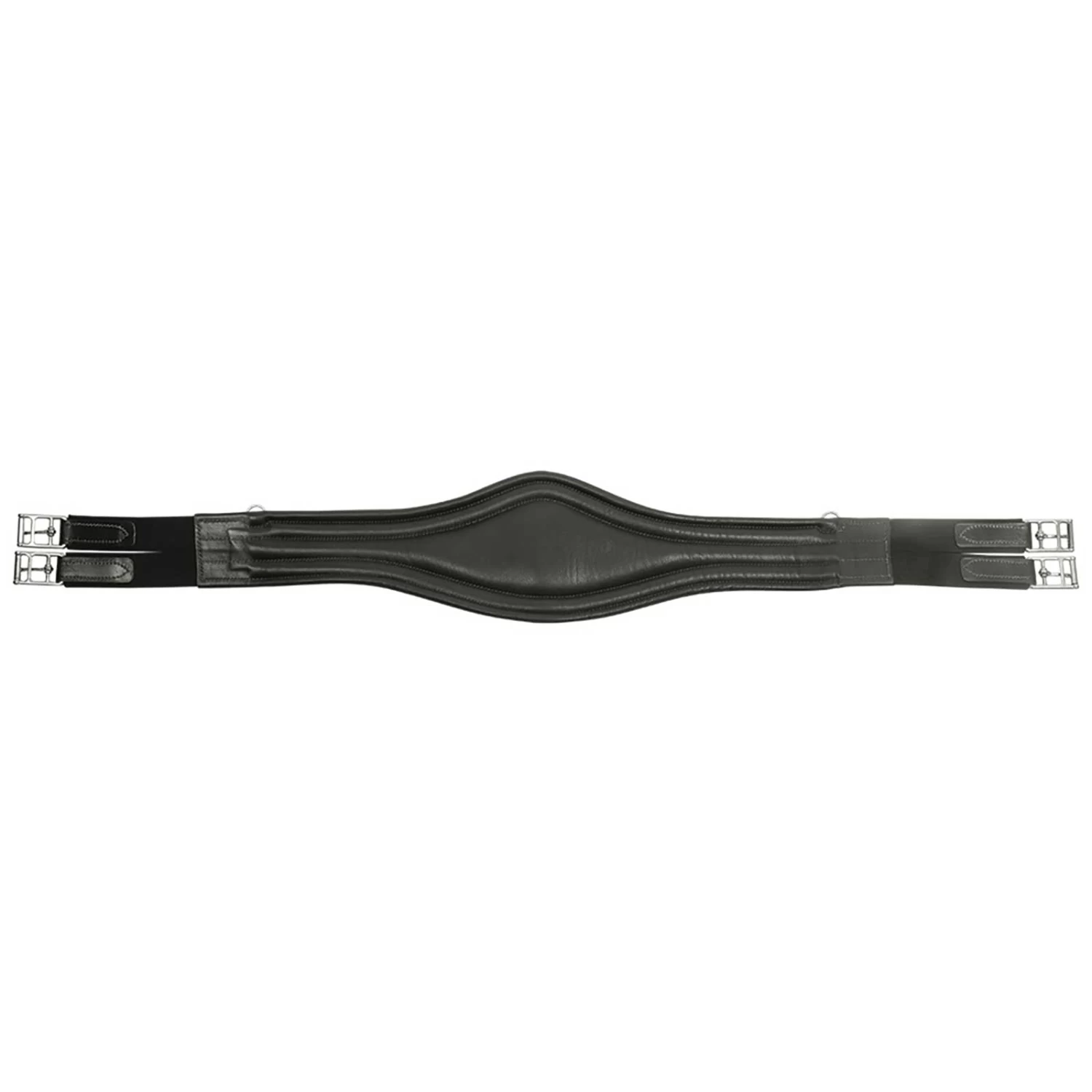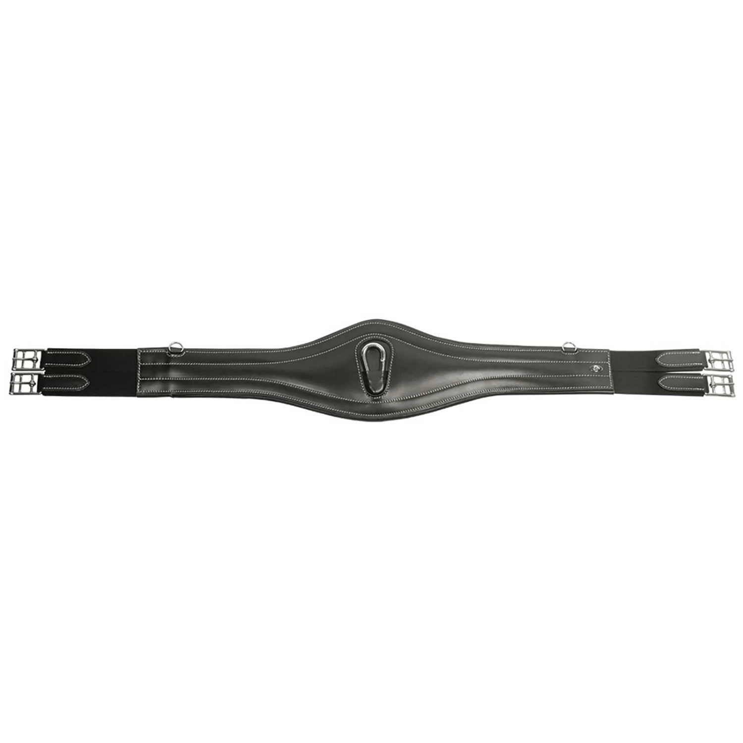 Anatomisch geformter Leder-Sattelgurt mit Karabinerhaken im Mittelstück und seitlich je einen D-Ring zum Einhängen von Hilfszügeln.
