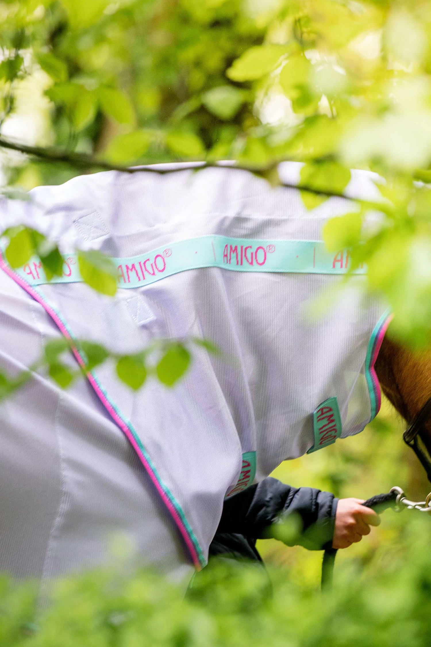 Gehfalten vorne, klassischer Frontverschluss, Auskleidung an Schulter und Mähne, Kreuzbegurtung, abnehmbares Halsteil, die silberne Farbe reflektiert das Sonnenlicht.