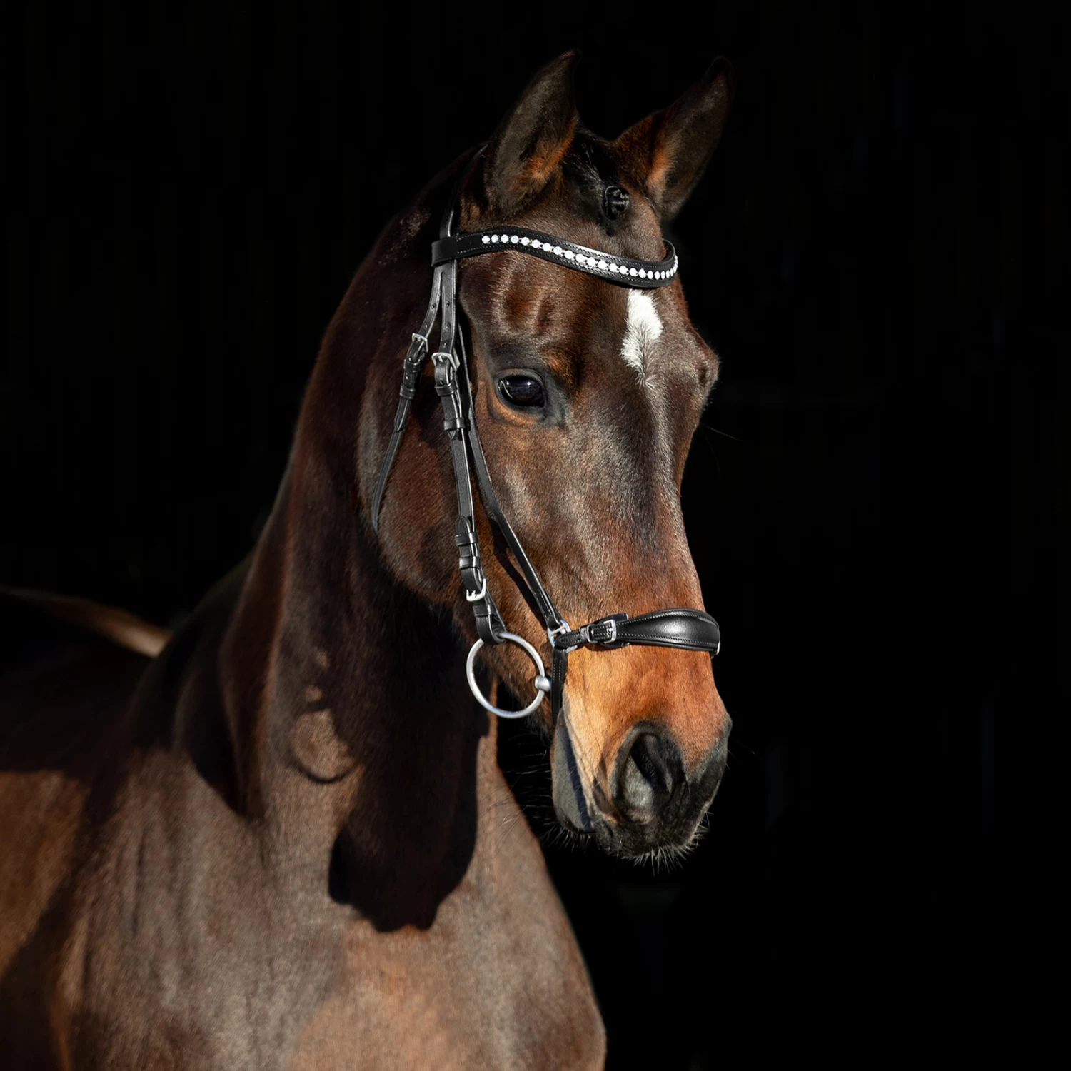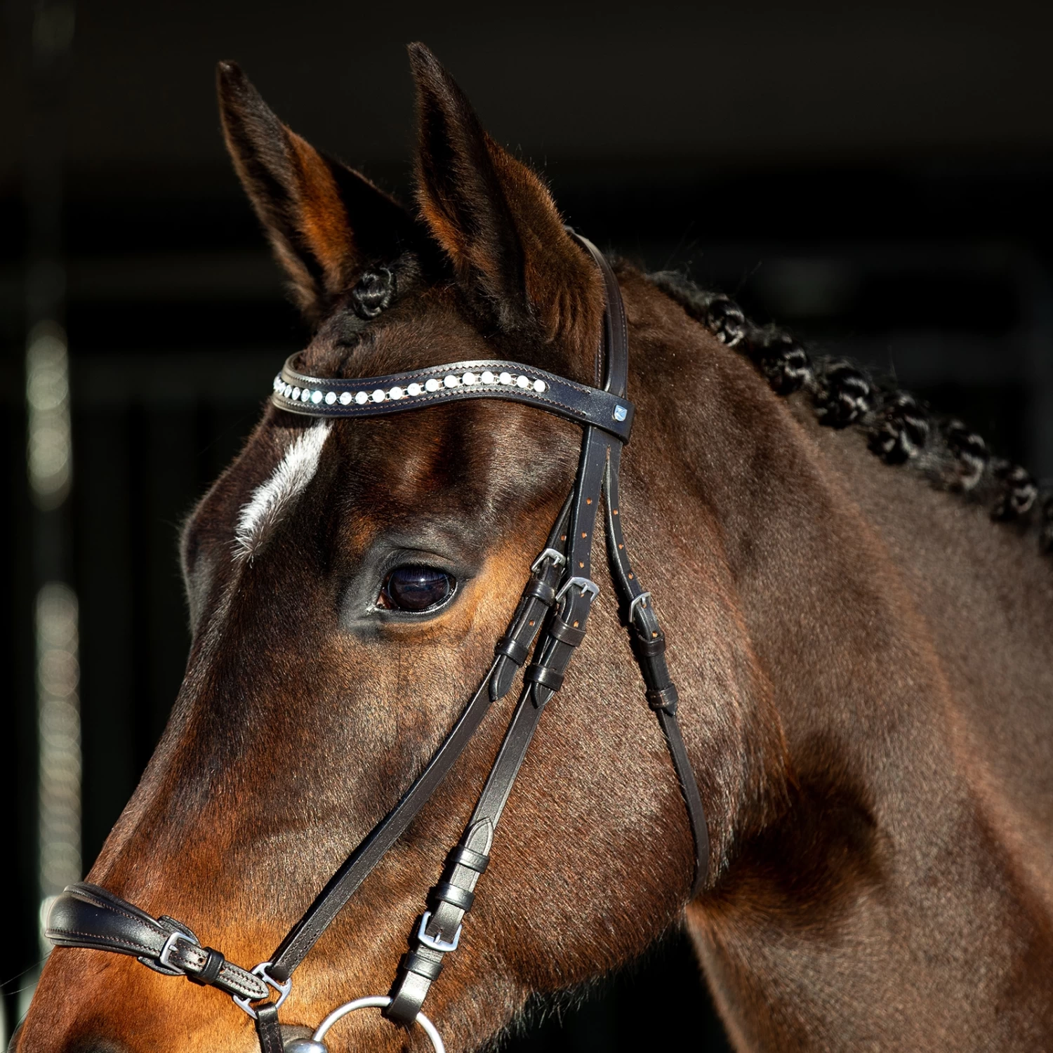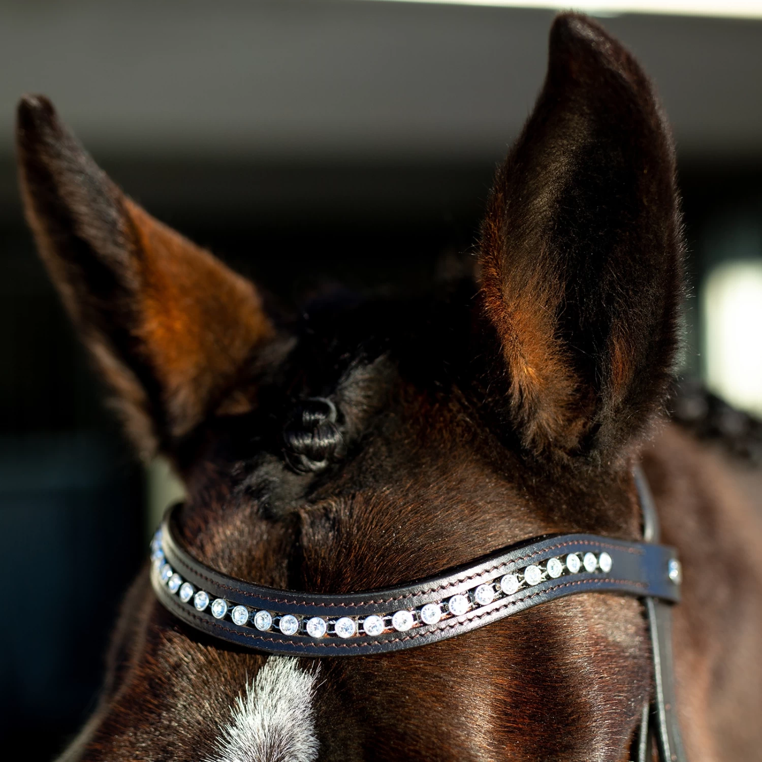 - Helle Kristall-Akzente am Stirnriemen