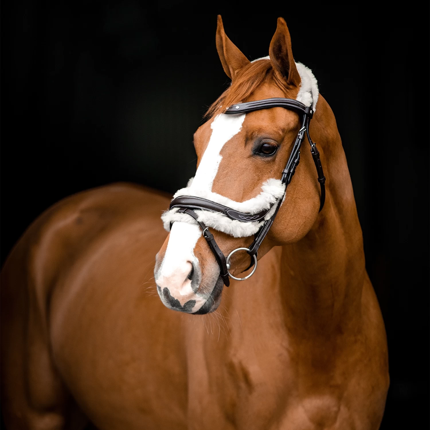 Der anatomisch geformte Stirnriemen wurde für den Komfort des Pferdes designed und bringt durch kleine Kristalle Glamour in seine Ausrüstung. Diese Trense verfügt über zwei abnehmbare Fütterungen in Kunstfell und super weichem Leder, die beide leicht mit Klettverschlüssen zu wechseln sind. Das Kunstfell schmiegt sich weich an die Nase deines Pferdes an. Außerdem verfügt die Trense über einen Sperrriemen mit Pullback-Verschluss.