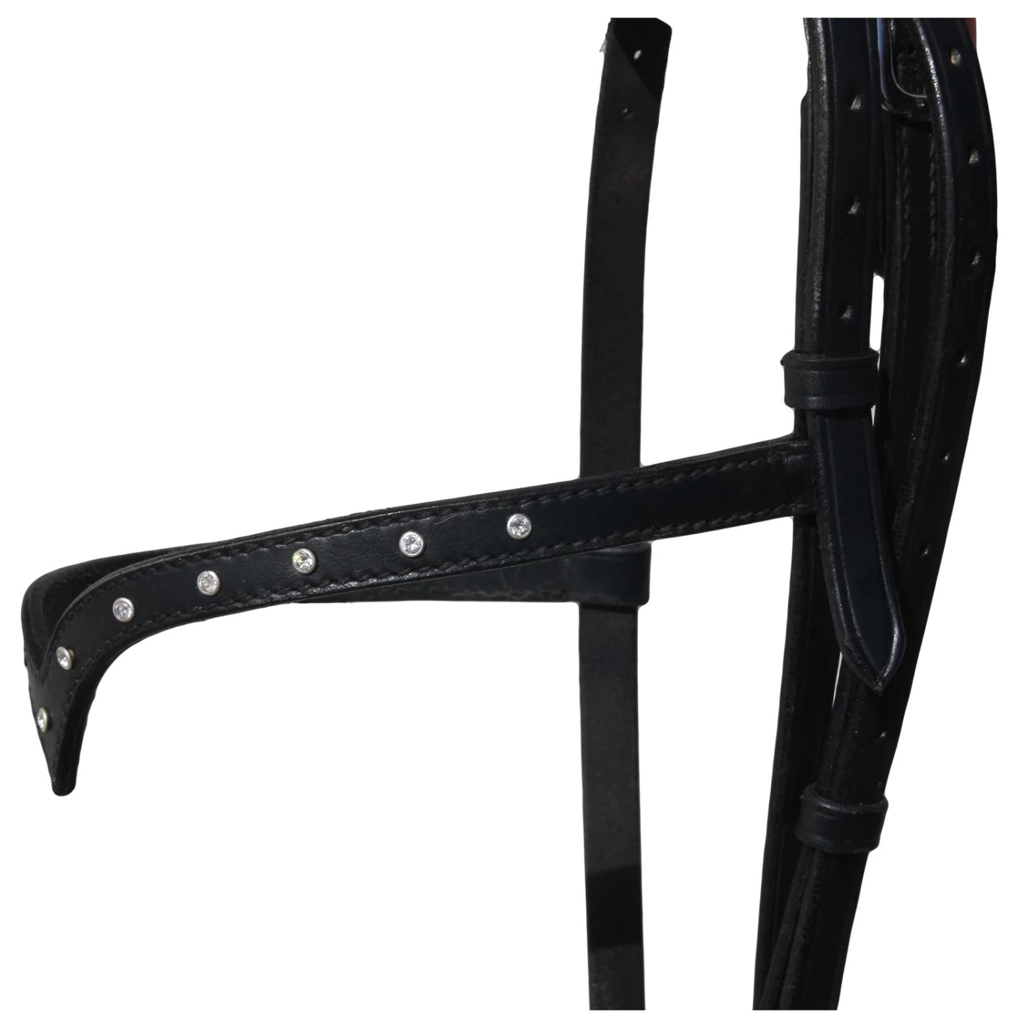 Eleganter Zaum mit V-förmigem Stirnriemen mit Swarovski Kristallen.Nasenriemen ist nicht beinhaltet.
