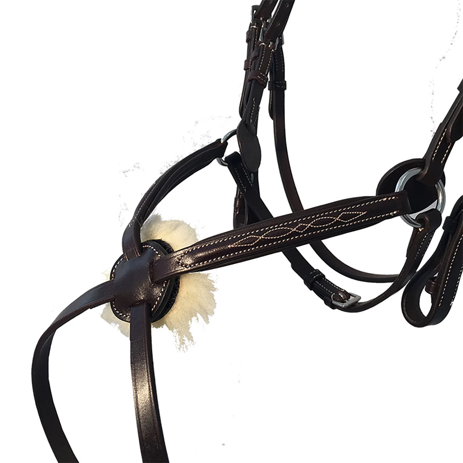 Die mexikanische Trense „Diandro“ besteht aus weichem Komfortleder und schmiegt sich angenehm an den Pferdekopf an. Das Genickstück ist anatomisch geschnitten und weich gepolstert. Kontrastnähte und Dekostick geben einen sportlichen Look. Das Nasenpolster ist austauschbar und besteht aus echtem medizinischen Lammfell. Das Stirnband ist leicht gebogen.