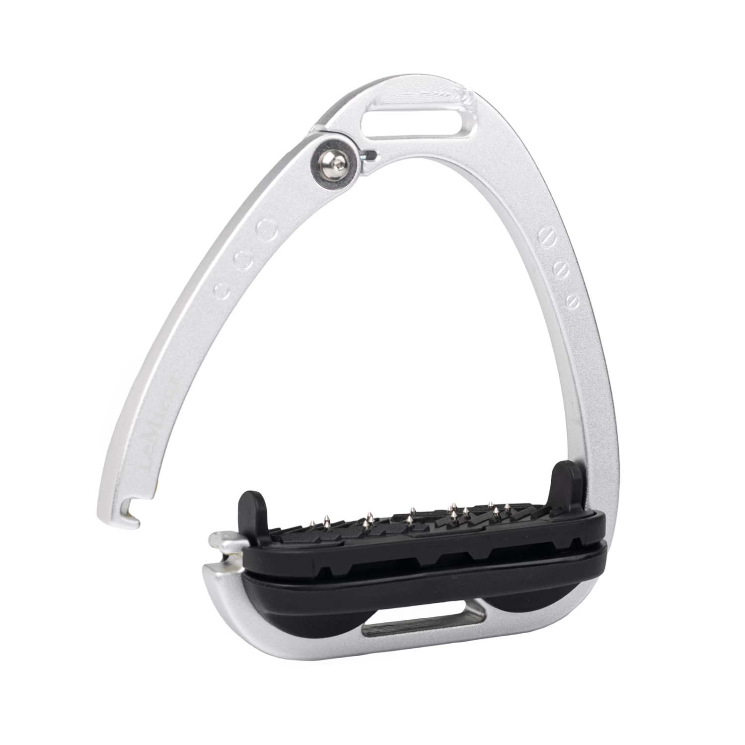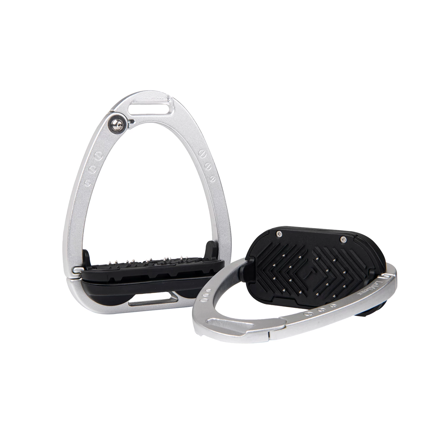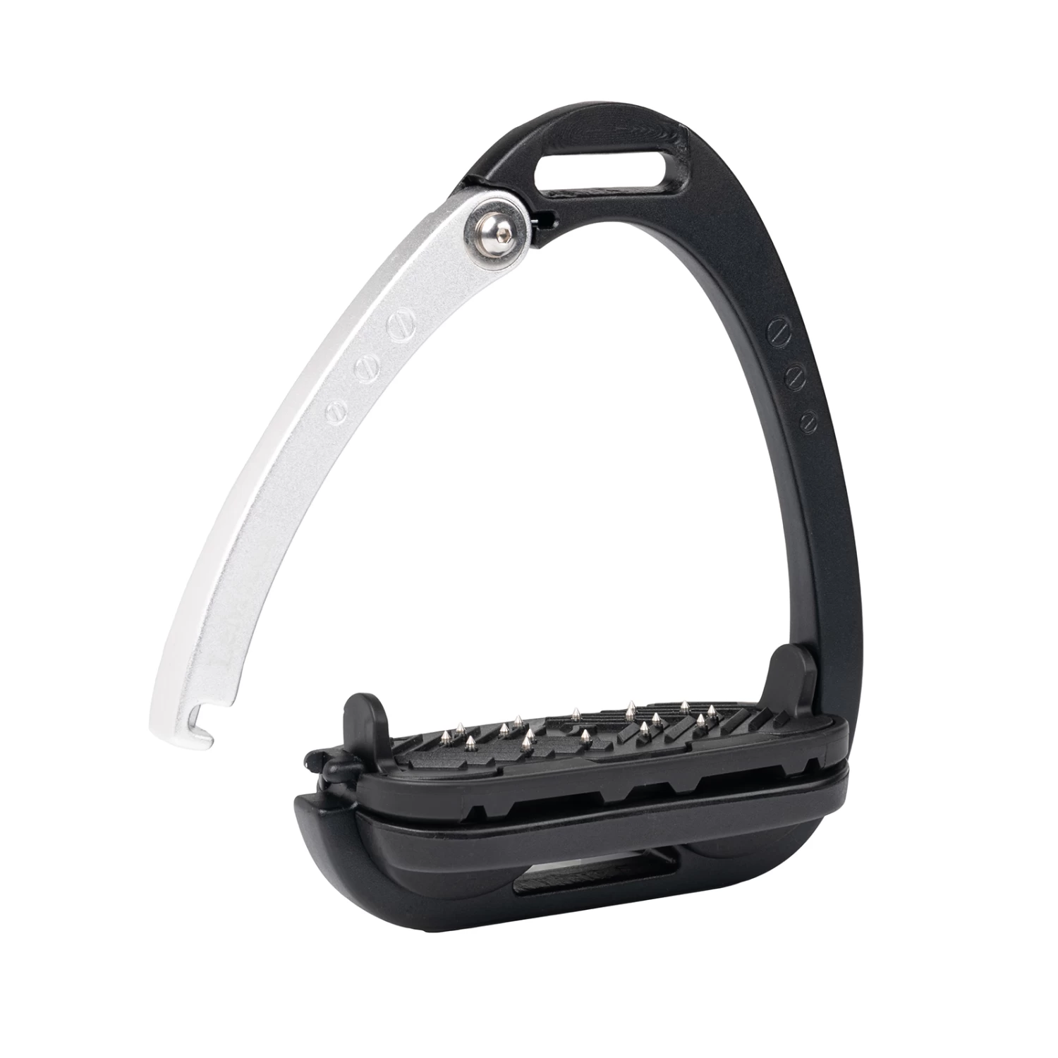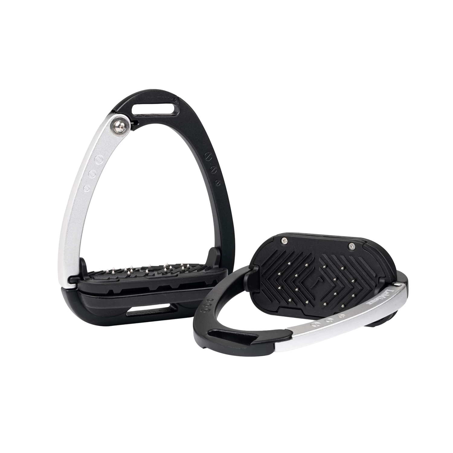 Die Trittfläche wird durch ein Twin-Balance-Bogensystem gestützt, das das Gewicht gleichmäßig auf die Basis des Steigbügelrahmens verteilt. Der Scheitelpunkt des Rahmens ist vertieft und versetzt, was eine 45º-Ausrichtung nach außen fördert und es dem Reiter erleichtert, den optimalen Winkel für den Fuß zu finden und einen verlorenen Steigbügel wiederzufinden.