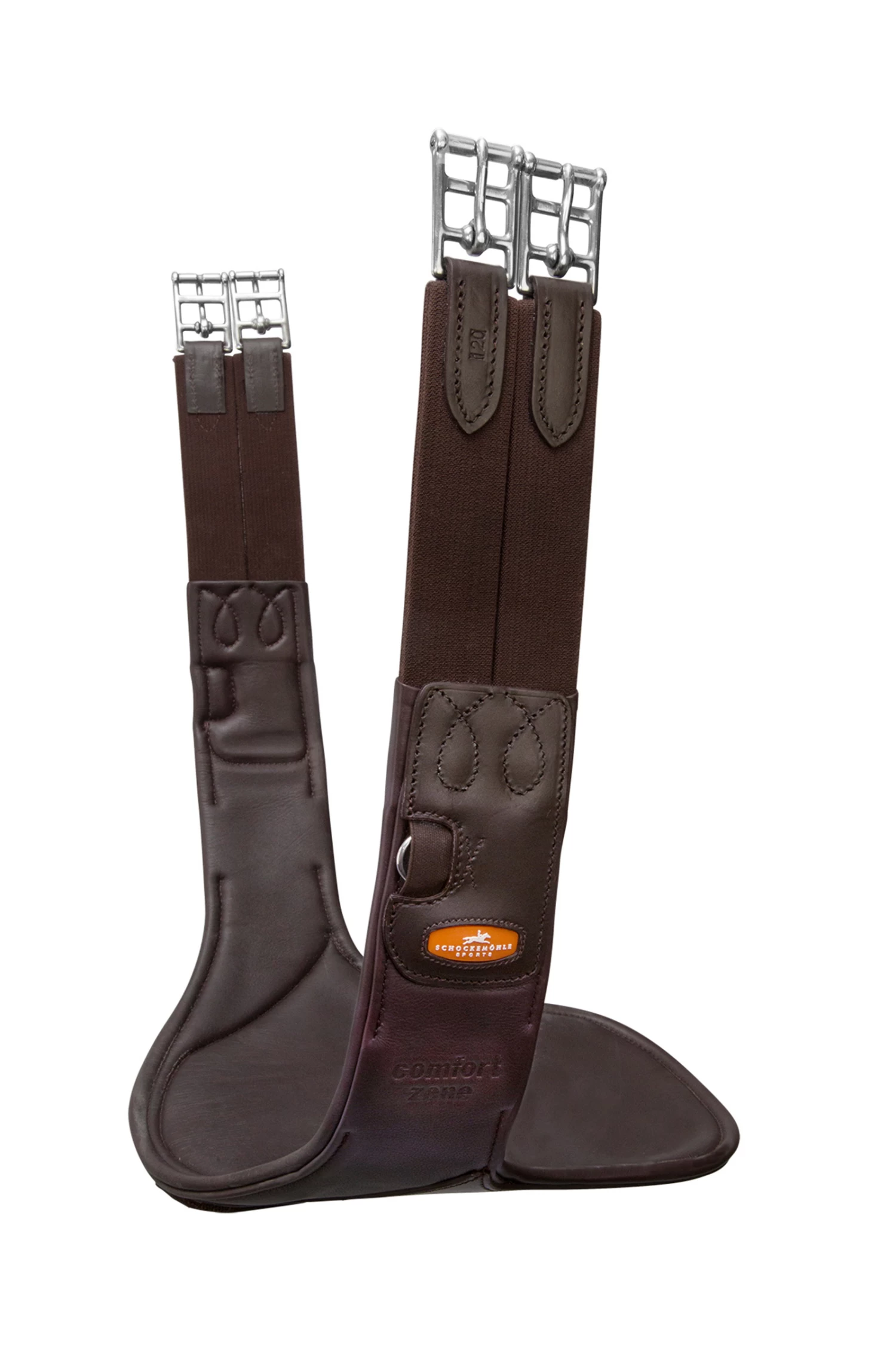 Mehr Bewegungsfreiheit dank optimaler Druckverteilung: Die innovative „Comfort Zone“ bei dem Stollenschutzgurt Oklahoma von Schockemöhle Sports setzt dafür neue Maßstäbe. Anatomisch geformt, ist der Sattelgurt im Bereich der Ellenbogen besonders flach gearbeitet. Gleichzeitig sorgt im Bereich des Brustkorbs die breitere Mittelplatte mit mehrlagigem Weichschaum für eine noch bessere Druckverteilung. Sie besteht aus festerem Leder und schützt damit auch vor Schlägen. Der große Karabiner erleichtert dem Reiter das Einschnallen des Vorderzeugs. Einmal befestigt, verhindert die Abdeckung mit der großen Lederklappe das gefährliche Hereintreten des Pferdes in beispielsweise ein Vorderzeug. Das beidseitige dreilagige Elastik sowie die weich gepolsterten Rollenschnallen heben den Komfort für das Pferd zusätzlich auf ein neues Level.